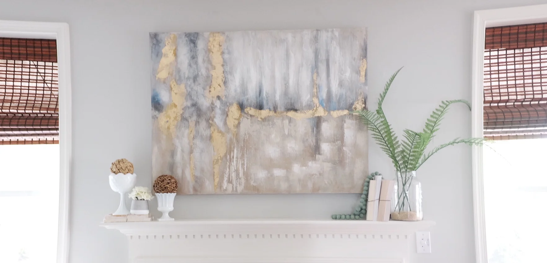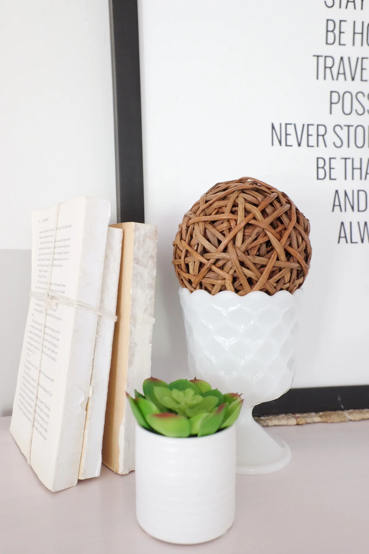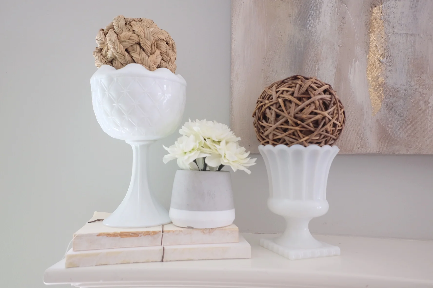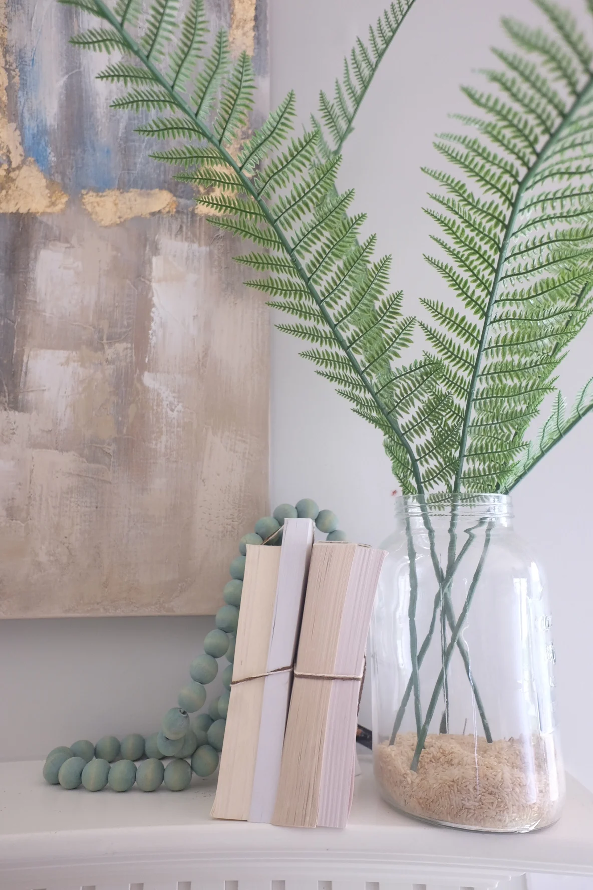 I like to use things I have around the house to decorate my mantle. Here I pulled out milk glass vases as well as well as a large glass jar. I put twine balls on top of the milk glass and I filled the jar with rice and then simply added faux greenery. These little touches were inexpensive and brought some spring flair into this space.
