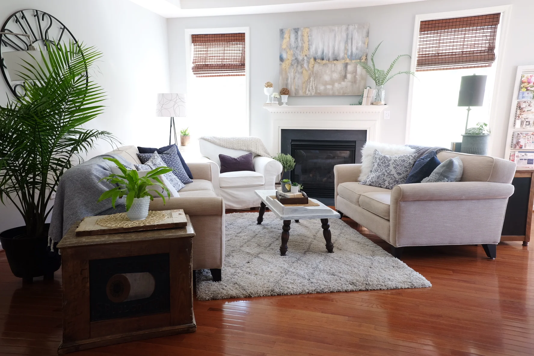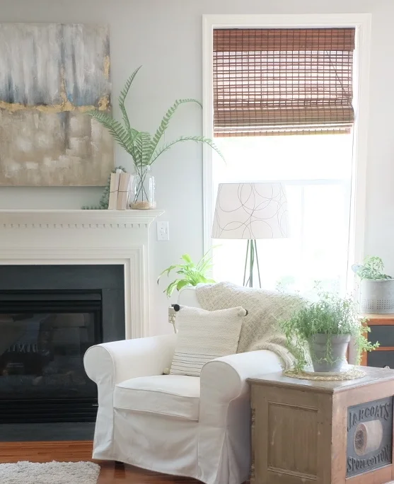I love angling my furniture in a square room. I also always bring my furniture away from the wall if the room is large enough to do this. This is an easy budget-friendly fix and gives a room a cozy bit of charm. Here you can see two different places where I've moved this white chair. Which place do you prefer?
