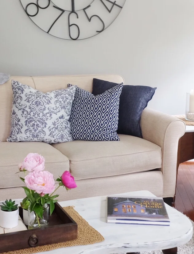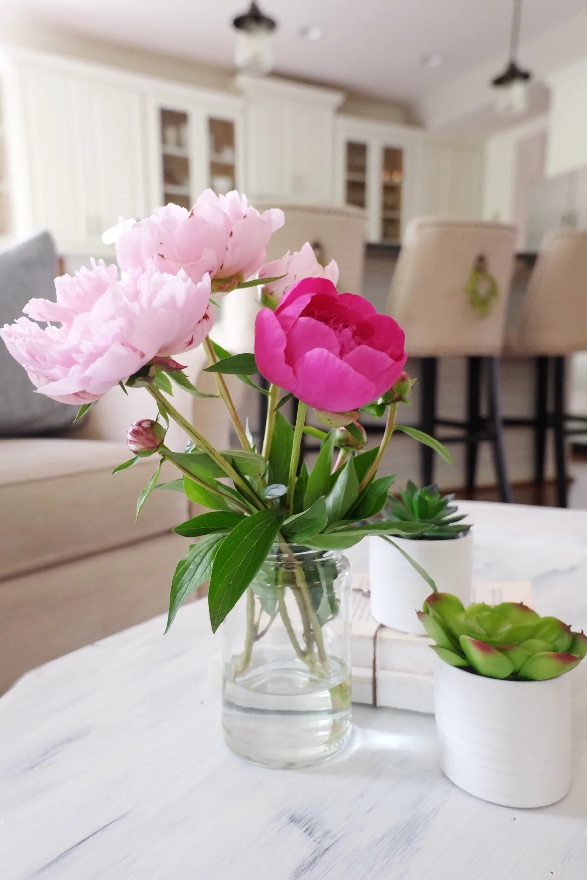 Also, don't forget to add some lovely spring flowers! The peonies from my garden are just starting to bloom so I couldn't resist adding them to my coffee table decor! I hope that you've gleaned insight on how to bring refresh your living room with a few little changes. My motto is "decorating on a budget is fun!"