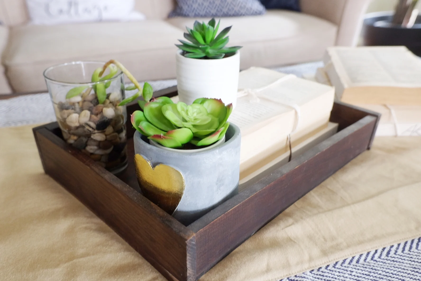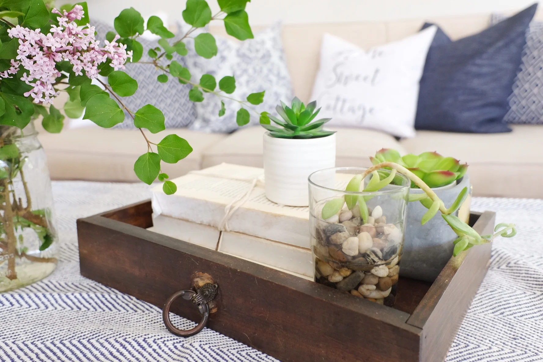 I added succulents to an old drawer to make a simple coffee table display. Some of these are real and some are faux. Can you guess which ones are not real?