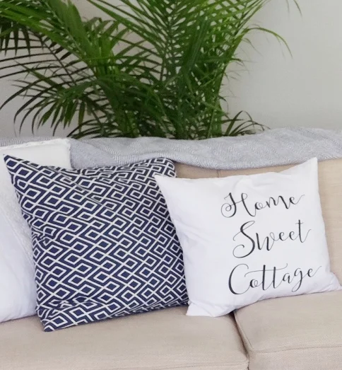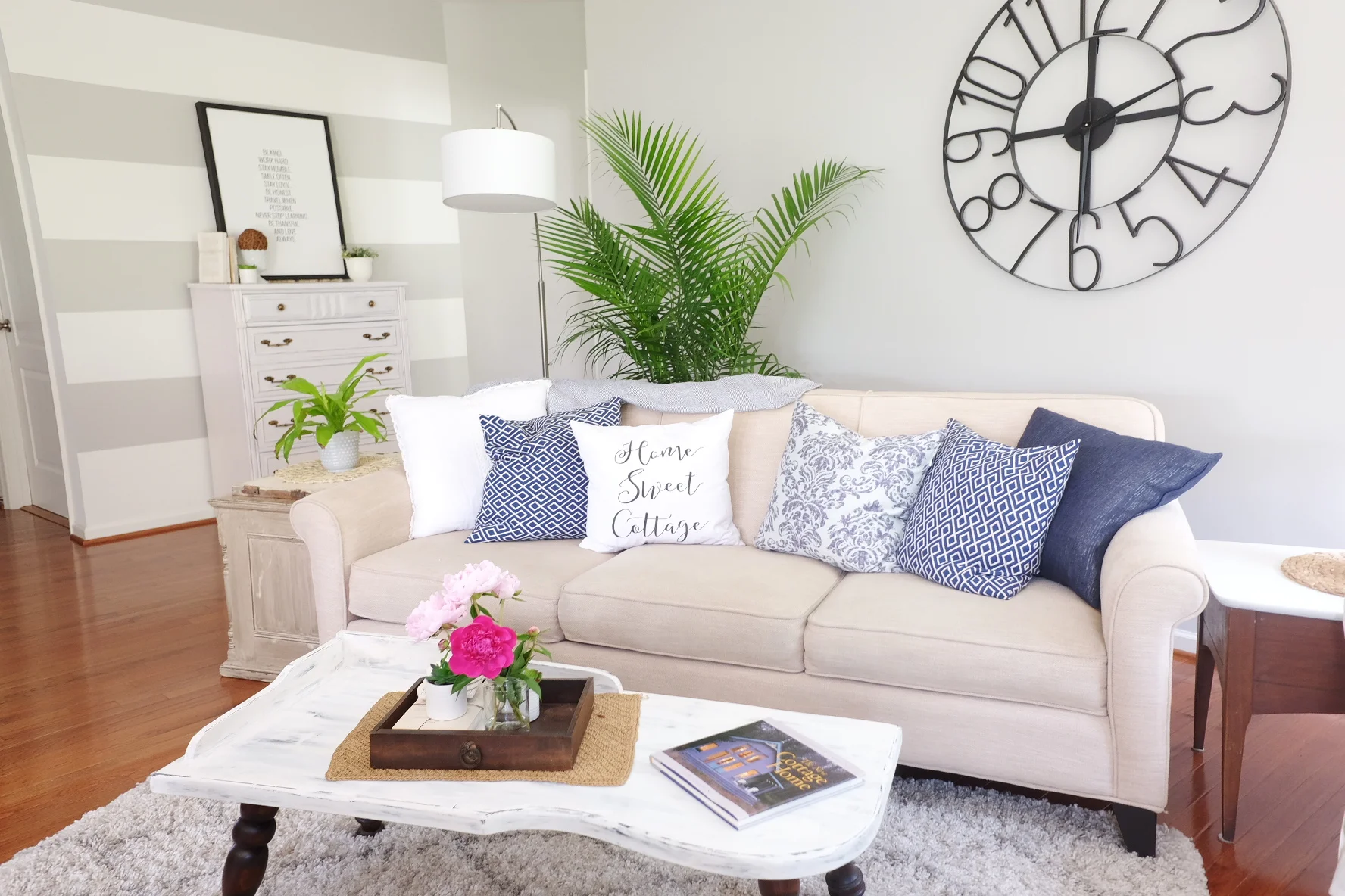 Sometimes all you need to do is to change up the pillows on your couch in order to bring a little spring refresh into your home. Pillows are a super easy way to bring color and texture into your space. I moved my black pillows out and replaced them with navy and blue toned ones for Spring. Most of my pillows have zippers which makes it easy to replace them. I simply zip off the outer pillow and store them flat when not in use and use the pillow insert for another pillow that is zipped right on. (Sources: Home Sweet Cottage Pillow: linenandivory.com; other pillows: H&M Home.com)